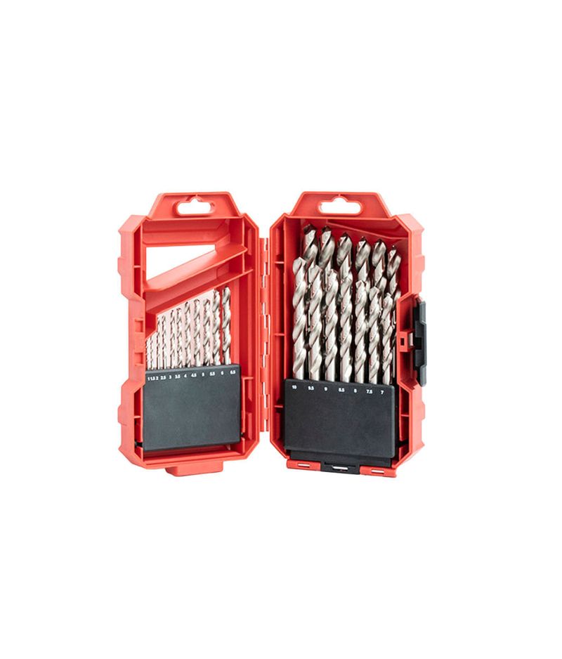 • 25 piezas. • 1, 1.5, 2, 2.5, 3, 3.5, 4, 4.5, 5, 5.5, 6, 6.5, 7, 7.5, 8, 8.5, 9, 9.5, 10, 10.5, 11, 1125, 12, 12.5 y 13 mm. • Para utilizar en aceros, aluminio, bronce y plásticos. • Punta autocentrante. Split Point que mantiene la mecha centrada al perforar y garantiza precisión en los resultados. • Fabricado en acero 4241. Prolonga su vida útil por su facilidad de afilado y alta dureza. • Apto para uso con taladro, taladro de banco, contrapunta de torno y fresadora. • Punta con ángulo de 118°. • Filos destalonados. Su diseño evita atascamientos en el material y permite evacuar fácilmente las virutas.